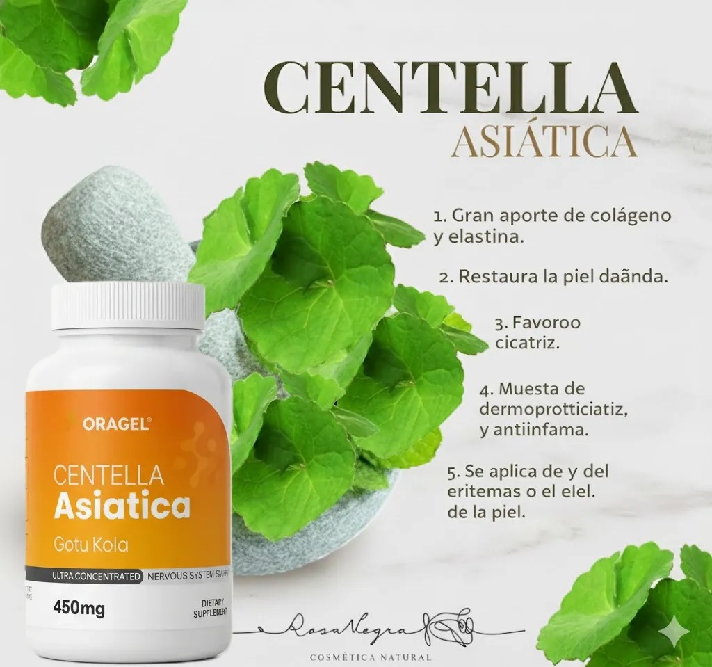 La centella asiática, también conocida como Gotu Kola, es una planta con una larga tradición en la medicina ayurvédica y china por sus efectos beneficiosos sobre la piel, la circulación y el sistema nervioso. Oragel, una marca reconocida en productos naturales, utiliza la centella asiática en algunos de sus suplementos y cosméticos, aprovechando sus propiedades restauradoras y de apoyo a la salud cutánea y venosa. Beneficios de la Centella Asiática de Oragel Mejora de la salud de la piel: La centella asiática es popularmente utilizada para mejorar la elasticidad y firmeza de la piel, lo cual ayuda a reducir la apariencia de arrugas y marcas. También puede acelerar la cicatrización de heridas y reducir cicatrices, incluidas las del acné. Reducción de la celulitis: La centella asiática estimula la producción de colágeno, lo que puede mejorar la apariencia de la piel en zonas con celulitis, ayudando a tensarla y reducir los depósitos de grasa visibles. Mejora de la circulación venosa: Este extracto es utilizado para tratar problemas de circulación, como la insuficiencia venosa crónica. Fortalece las paredes de los vasos sanguíneos, lo cual reduce la hinchazón y el riesgo de formación de várices y edemas. Apoyo al sistema nervioso y mental: La centella asiática es conocida por mejorar la memoria, la concentración y reducir la ansiedad, ya que ayuda a regular la producción de neurotransmisores y mejorar la oxigenación cerebral. Efecto antioxidante y antiinflamatorio: Los antioxidantes en la centella asiática protegen las células del estrés oxidativo y la inflamación, apoyando tanto la piel como el organismo en general. Funciones de la Centella Asiática La centella asiática funciona a través de varias acciones clave en el cuerpo: Estimulación de la síntesis de colágeno: La centella asiática activa la producción de colágeno, una proteína esencial para mantener la estructura y elasticidad de la piel y vasos sanguíneos. Mejoras en la microcirculación: Esta planta aumenta el flujo sanguíneo a nivel capilar, lo cual ayuda a reducir la retención de líquidos y a mejorar la nutrición celular en la piel y tejidos subcutáneos. Regulación de neurotransmisores: La centella asiática ayuda en la producción de neurotransmisores que apoyan el equilibrio mental y el alivio del estrés, lo que mejora la función cognitiva. Conclusión La centella asiática de Oragel es un suplemento con múltiples beneficios para la piel, la circulación y el sistema nervioso. Sus propiedades regeneradoras y antioxidantes la hacen ideal para mejorar la salud cutánea y ayudar a quienes padecen problemas de circulación. Modo de uso: Vierte agua 200ml en una vaso y utiliza un capsula diaria 30 minutos antes de los alimentos. Puedes consumirla en cualquier momento del día.